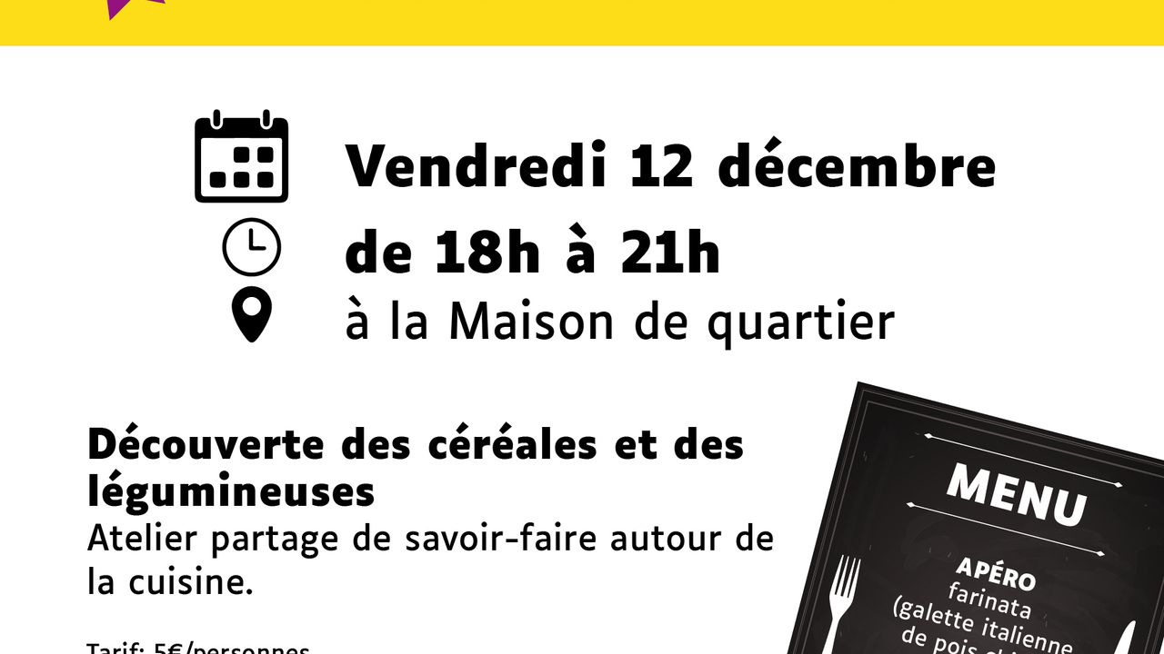 Atelier partage de savoir-faire autour de la cuisine de légumineuses et d céréales. Venez découvrir cette nouvelle tablée, cuisiner et partager ensemble le repas.